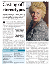 Patrick Newley, The StageAn article from the stage about Jennifer is available here in PDF format. Arsala Qureishi & Sabrina Louis, Vandal Movies Pvt. Ltd.Casting for 'The Unforgettable' is what we considered an arduous task. With her immense experience and in-depth understanding of what 'a film' requires, Jennifer Jaffrey made the casting of 'The Unforgettable' feel like a walk in the park. She is undoubtedly the 'Casting Guru'. Shani Grewal, Director, Guru in SevenWithout Jennifer Jaffrey 'Guru in Seven' simply would not have been made. Ismail Merchant, Hullabaloo in Old Jeypore (book)...she brings the kind of forthright, western approach to her work that is essential for a casting agent, applying standards of selection which western directors working in India appreciate and must rely on... Zafar Hai, The Perfect MurderJennifer has a very good grasp of the cinema & theatre scene here in India relating to her sphere of activity. She was energetic, inventive & persistent in looking for just the right actor or actress. Joy Whitby, Grasshopper ProductionsHer sensitivity to the needs of each script and her exhaustive enquiries into available talent were invaluable. She has a wide network of contacts and a systematic method of documentation which she shared most generously. Rolf Forsberg, Forsberg Film Group, IncJennifer has been outstanding with her handling of pre-productions. She has tackled her tasks with energy and enthusiasm. She is personable and easy to work with, Efficient, good at details. A problem solver. And a good manager. The Times Group, Tony LeliwHer agency has helped some of Britain's top Asian actors (excerpted from an interview in 1999). |